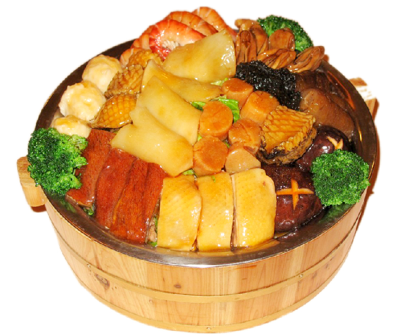 ????江濱國際大飯店珍寶軒中餐廳也推出了“極品盆菜”。由鮑魚、雞、鴨、魚、蠔、腐竹、蘿卜、香菇、豬肉等十幾種原料組成,食材分別要經過煎、炸、燒、煮、燜、鹵后,再層層裝盆而成,內里更有乾坤,層層吃下去,味道馥郁香濃,令人大有漸入佳境之快。訂菜也非常方便,只需提前6小時電話預約取貨即可。