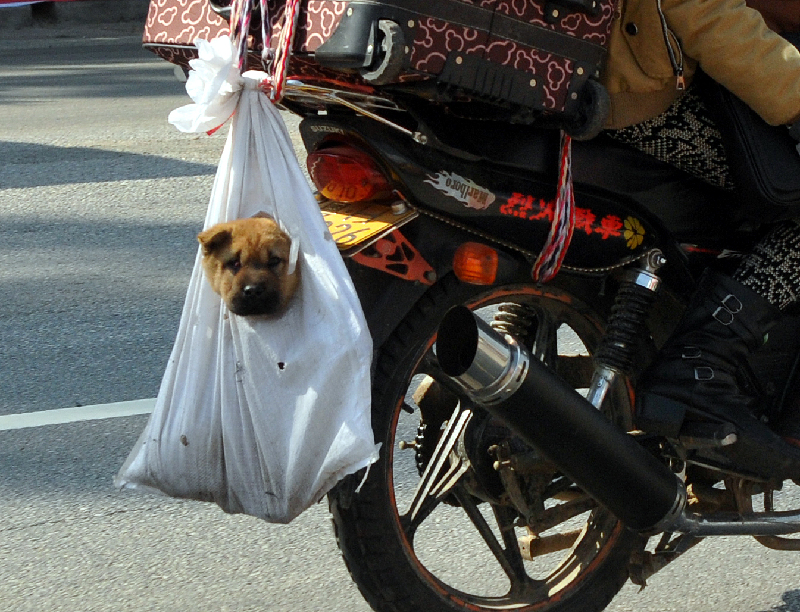 ????一位趕著回貴州的返鄉務工者的摩托車尾上,滿載著他的家當:水鞋、塑料桶,還有在異鄉陪伴他打發寂寥生活的小狗。