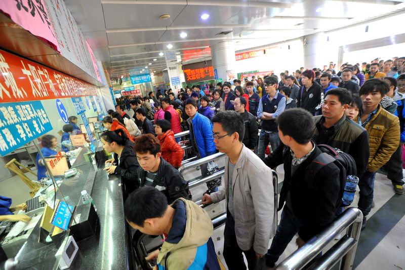 ?2月6日,旅客在金暉車站售票大廳買票。當日是春節假期結束的前一天,梧州市迎來了節后返程客流高峰,車站內售票廳和候車大廳人頭涌動,車站加開了多個臨時售票點和車次,全力疏導旅客。記者 何鎏/攝