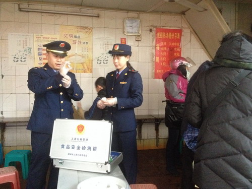 ????執法人員一邊介紹,一邊隨機抽取該店內的糯米粉。只見執法人員往試管中放進糯米粉,滴入試劑,用力搖勻后,觀察混合物顏色。看到乳白色的混合物顏色沒有發生變化,執法人員表示,混合物顏色不變,初步鑒定該糯米粉不含吊白塊,“如果混合物變紫紅色,可初步認定糯米粉含吊白塊。”
