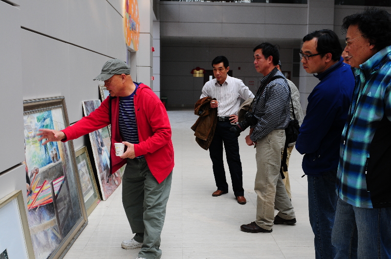 ????2月4日享譽海內外的著名油畫家蔡楚夫(左一)回到梧州,與梧州西畫會的藝術家們分享自己多年的個人經驗與經歷,也對梧州西畫群體的藝術作品進行了點評。
