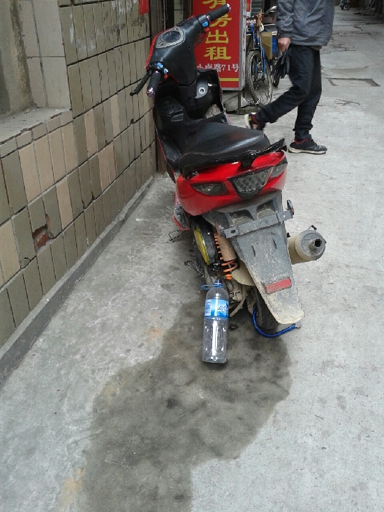 ????記者目睹小南路一輛助力車被偷汽油的經過,小偷用一個塑料瓶的瓶口對著車的油管偷油,地面留下一堆油漬。 西江都市報記者 董宏偉/攝