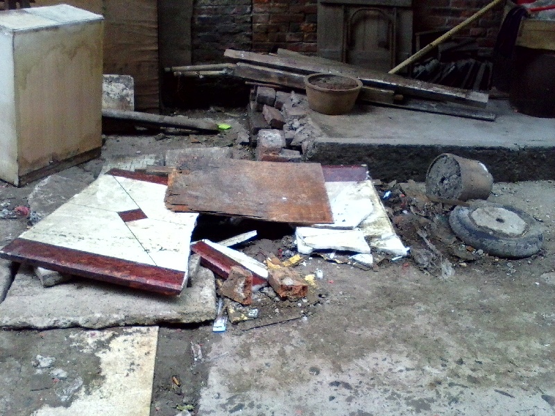 ????在道路一側有一個沒有井蓋的大坑,里面積滿污水,蓋住大坑的水泥板以及瓷磚都已經被壓碎。