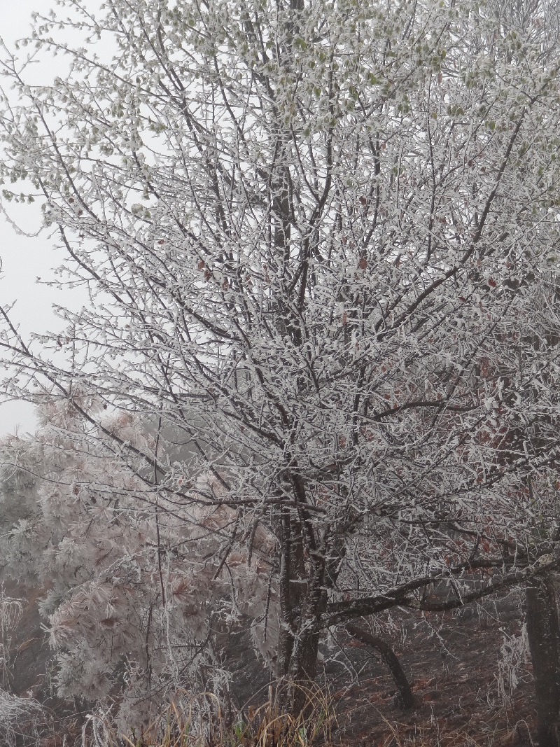 ????連日來,受強冷空氣南下影響,蒙山縣北部地區氣溫低至1.6℃左右,部分高寒山區出現冰掛現象。漫山的樹木被透明的冰層包裹著,晶瑩剔透、瑰麗迷人,成了一件件天然冰雕藝術品。