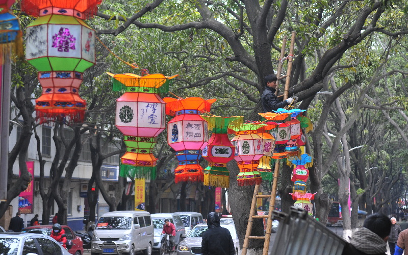 ????2月13日,在一中花圃附近,工作人員在路樹上掛花燈。