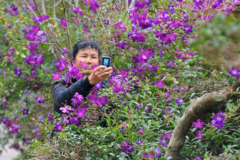 ????2月15日,白云山公園四恩寺入口處,首先映入眼簾的,是山腰間那一簇簇的紫色巴西野牡丹,夾道歡迎著過往的游人。不少市民看到這樣的美景都忍不住贊嘆起來。