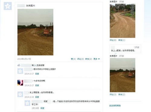 ????林水中學位于龍圩區龍圩鎮都坎村內,學校的師生上學,需要走一條必經的、約一公里的黃泥路。2月17日,一位網友在網絡上發布了一張通往林水中學的“上班途中的照片”,照片拍攝的正是這條黃泥路,且由于近期雨天,道路十分泥濘。照片在網上發出后,多位網友紛紛留言表示有同感。一位網友對此評論說:“每天上班如同行走在薄冰之上,戰戰兢兢,除了考驗開車技術,還是一種心理上的煎熬!”