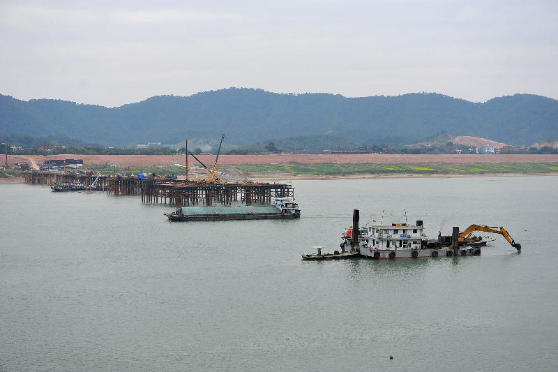 ??? 2月21日,記者在西江四橋施工現場看到,南北兩岸搭建的向江心延伸的施工便橋之間,施工人員正利用挖掘器械進行水下清渣作業。西江都市報記者 何鎏/攝