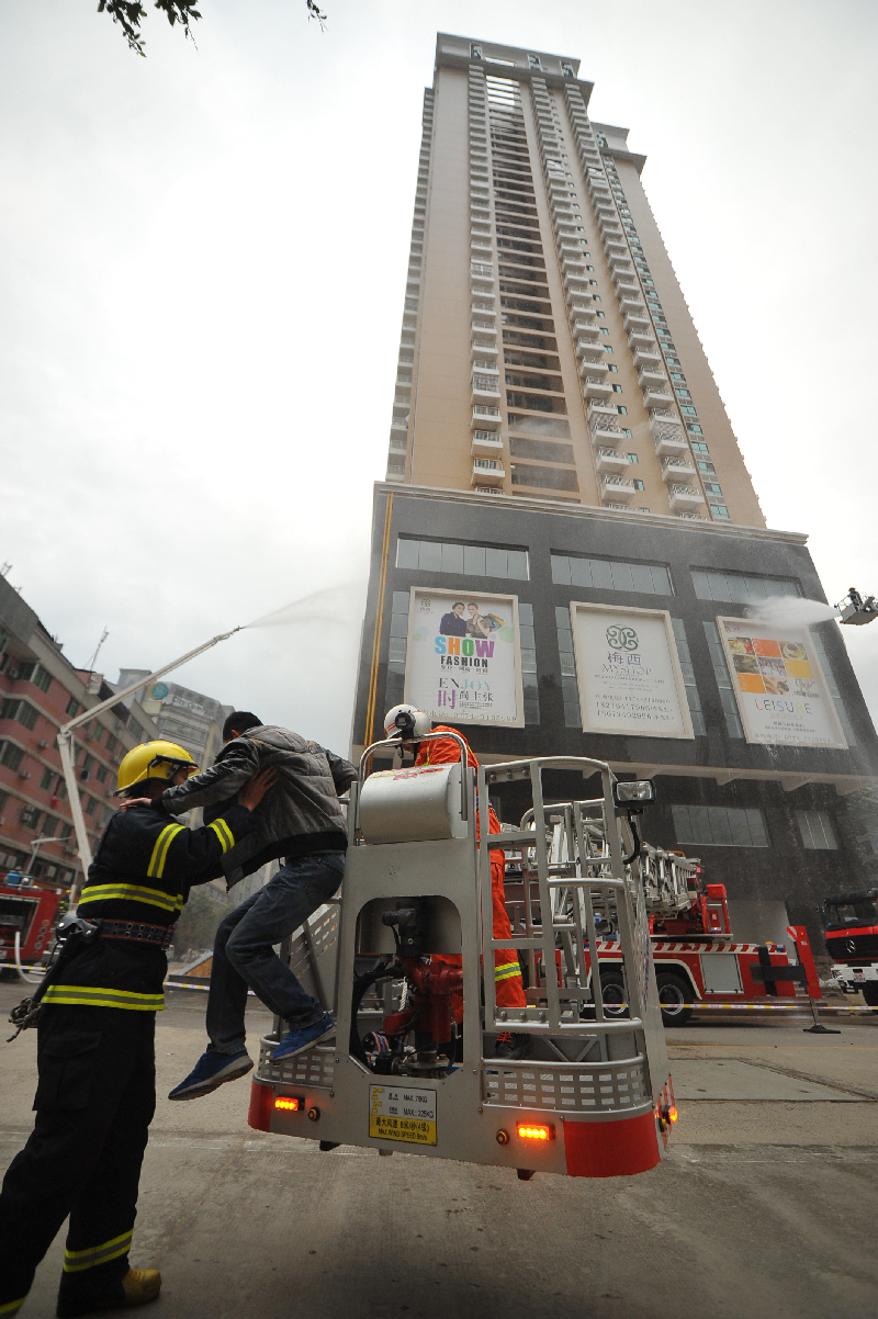 ????下午5點(diǎn),演練正式開(kāi)始。參與演練的警戒人員紛紛做好各路口及作業(yè)區(qū)正下方的安全警戒工作。此時(shí),神冠豪都商住樓的第6、9、10層忽然冒出了刺鼻的濃煙,上述樓層的陽(yáng)臺(tái)上分別出現(xiàn)“求救群眾”。他們不斷地?fù)]舞手中的衣服,傳遞求救的信號(hào)。隨后,市消防特勤中隊(duì)組成1個(gè)滅火和2個(gè)救援小組,長(zhǎng)洲中隊(duì)組成2個(gè)滅火小組從西北面樓梯深入起火的樓層進(jìn)行疏散居民和滅火救援。另一方面,特勤、河西、河?xùn)|等中隊(duì)的云梯消防車、高噴車、水罐車分別在新湖一路和新興珠寶路對(duì)神冠豪都住宅部分樓層進(jìn)行滅火,并測(cè)試舉高類消防車垂直高度上的滅火救援能力。