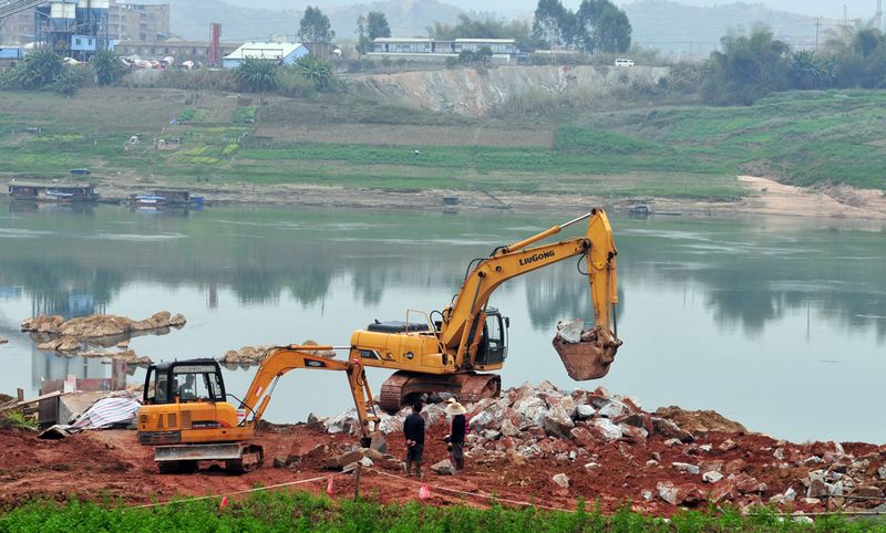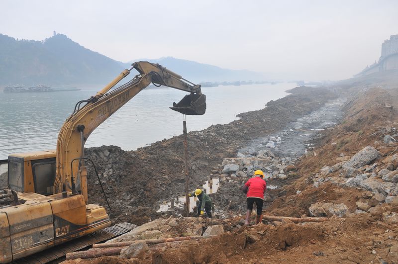 ??? 2月28日,在云龍大橋北橋頭河岸邊,工人們正修筑護堤。