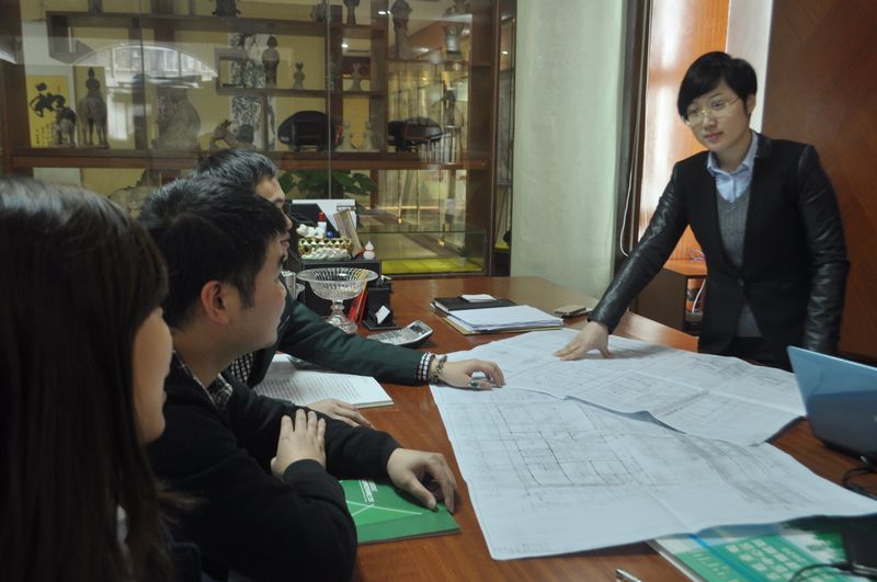 韋丹(右一)與自己公司的團隊商討各種策劃方案。萬立平/攝
