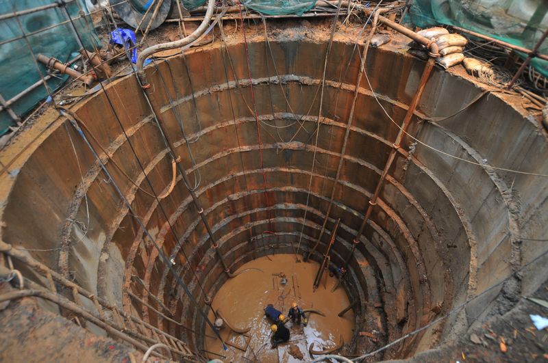??? 3月6日,在富民一路,工人正在井下鋪設(shè)排水管。