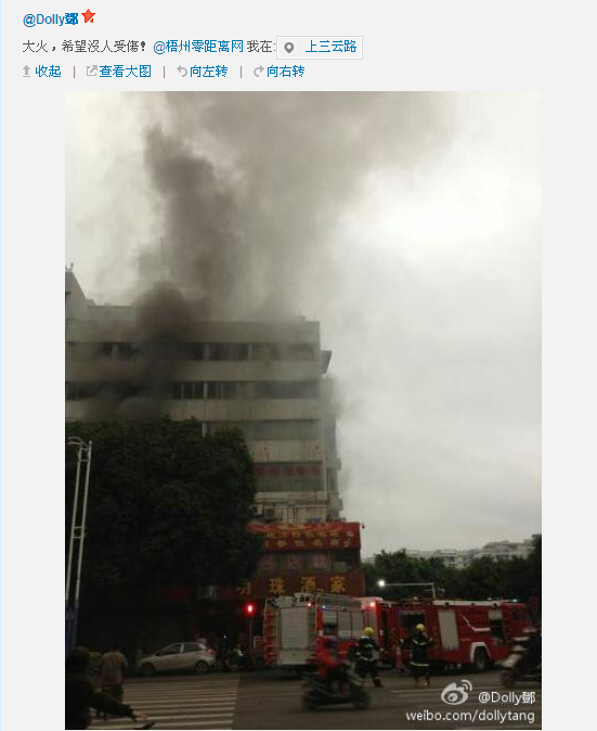 ?今日(7日)18時,網(wǎng)友@Dolly鄧發(fā)表微博稱:大火,希望沒人受傷!并配上兩張現(xiàn)場圖片。圖片顯示,起火位置在潘塘公園路口明珠酒家樓上,現(xiàn)場明火頗大,還冒起濃煙,消防官兵已到現(xiàn)場撲救。