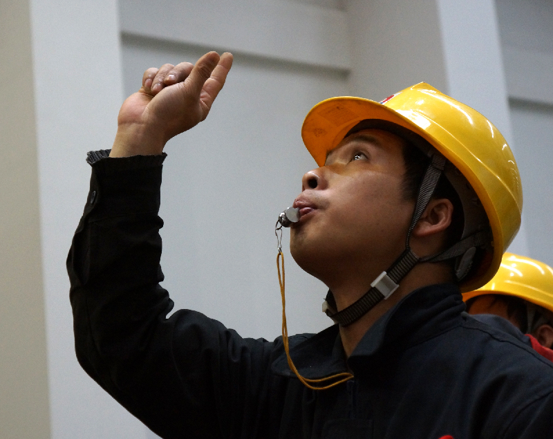 指揮員通過哨聲和特定的手勢,指揮吊車進(jìn)行轉(zhuǎn)子的吊裝。