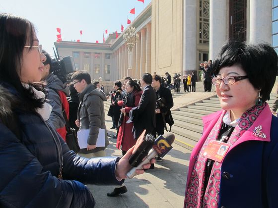 全國人大代表、中恒集團(tuán)董事長許淑清在北京人民大會堂前接受廣西電視臺記者采訪。