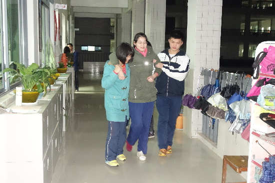 梁舒晴在同學的攙扶下,走回教室進行晚自習。西江都市報記者 龍天傳/攝