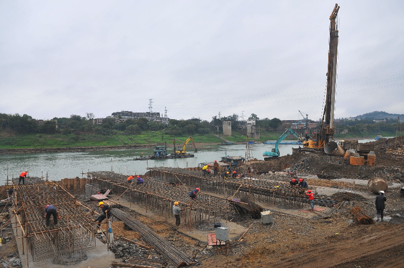 ????3月11日,在萬秀區(qū)城東鎮(zhèn)大利口碼頭,工人正綁扎帽梁鋼筋籠。