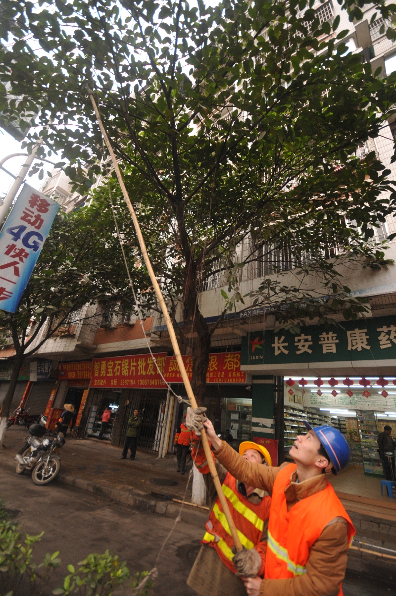 ????站在自行車道上仰頭望去,手中的高枝剪在縱橫交叉的樹枝中要么被扣住了繩索不能移動,要么是不知道選哪根樹枝才合適。看著記者無從下手,一名在旁休息的工人忍不住走過來幫忙,“先找準要剪掉的枝條,把剪刀口扣過去,用力把牽引的繩索一挫,這樣就行了。”他一邊說一邊將記者手中竹竿頂端的剪刀靠近一條樹枝,右手往繩索上輕輕一拉,咔嚓一下就把一根成人拇指般粗的樹枝剪了下來。