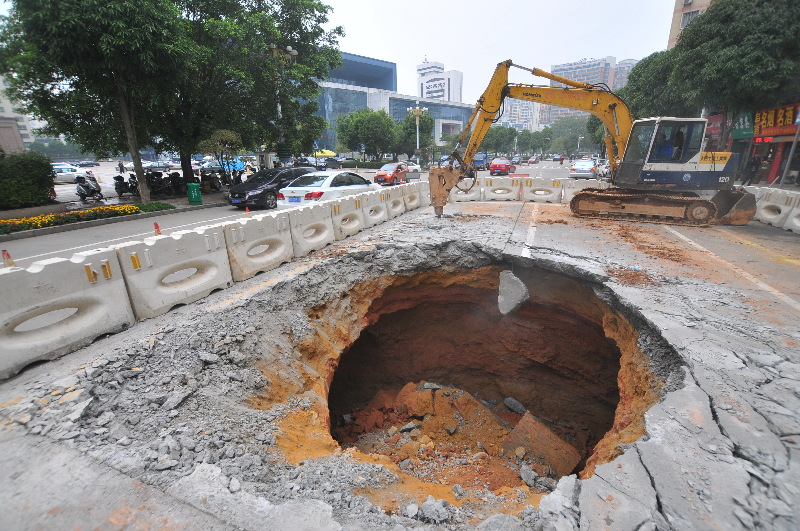 ??? 3月14日下午,在奧奇麗路,市政部門已組織施工隊伍對道路進行破拆,以修復路基。 據了解,13日下午市政部門工作人員在下水道排查時,發現奧奇麗路中段的一處機動車道發生路基下沉,路下大量泥土被淘空,下沉深度近八米,市公安交警部門隨即對該段道路進行了封閉。 李鴻榮 梁萍 徐新榮 攝