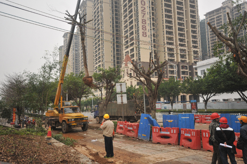 3月17日,在西堤路綠化帶,園林工人在吊機的幫助下移除景觀榕樹。該段綠化帶上綠化作物的移除為正在進行的西江四橋給水管改造工程清除了障礙。 西江都市報記者 蒙紹松/攝