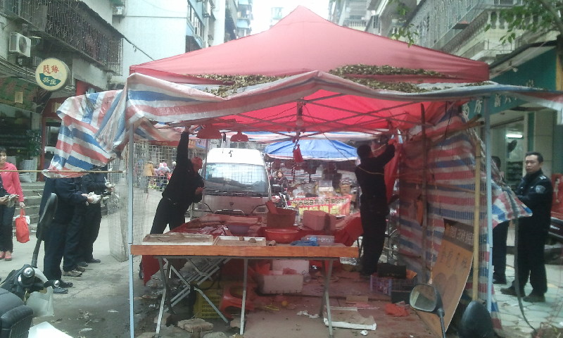 3月17日,城監工作人員對京梧市場外面道路上的違章占道攤檔進行拆除。該條道路上擺滿了各類攤點,占去道路一半的寬度,拆除占道攤檔可以恢復道路通暢。 阿萌/攝