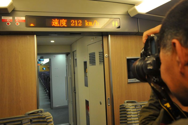 ????駛出梧州南站站場后,動車逐漸提速。“50、100、140……” 乘客們都聚在車廂連接處,目不轉睛地盯著顯示火車時速的液晶屏上不斷變化的數字,當時速超過200公里時,大家紛紛發出感嘆聲。