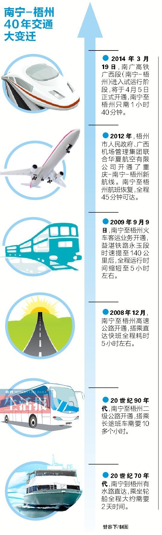 ????“直到2008年12月南寧到梧州的高速公路開通后,人們的出行才變得快捷起來,乘坐南寧各大車站開出的直達快班,5小時左右即可到達梧州,途中還配送一份快餐,非常方便。”周先生說。
