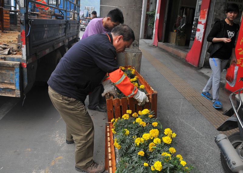 ??? 3月20日,在南環(huán)路,工人正更換路邊的木質(zhì)花壇。