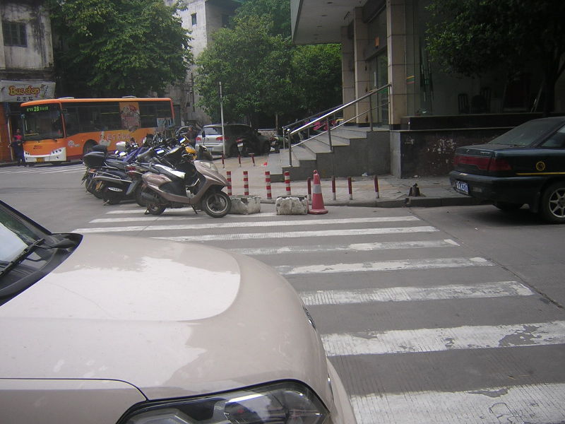 ??? 北環(huán)路原北山飯店前一條斑馬線被人用鐵柱、石頭等阻攔放車,但車輛依然照停放,阻礙了行人過馬路。 李定國/攝