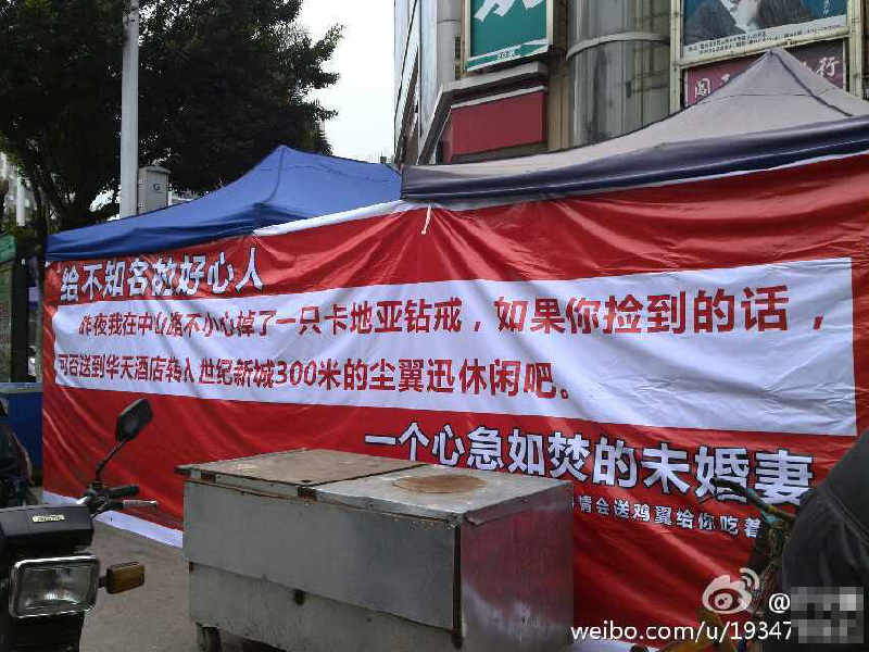 ????西江都市報訊(記者 龍天傳)近日,有梧州網友在新浪微博發帖,在太陽廣場前見到這樣一幅“尋物”橫幅:“昨夜我在中山路不小心掉了一只卡地亞鉆戒,如果你撿到的話,可否送到×××路的塵翼迅休閑吧……”可瀏覽起落款,也讓人不禁困惑:這是否是一則廣告?因為,對方在后面提及會以“烤雞翅”作為答謝。