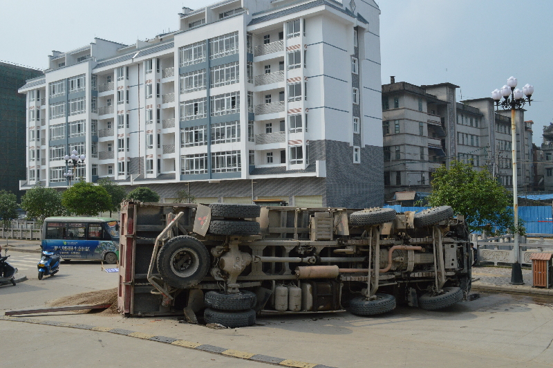 ??? 3月27日上午,在蒙山縣城第一中學大門前的路段,有一輛裝滿細沙的重型大貨車在此路過。司機在倒車掉頭時,后輪壓塌了一個水泥井蓋,引發側翻事故,沙子灑滿一地,幸無人員受傷。(戴連升 彭峰/攝)