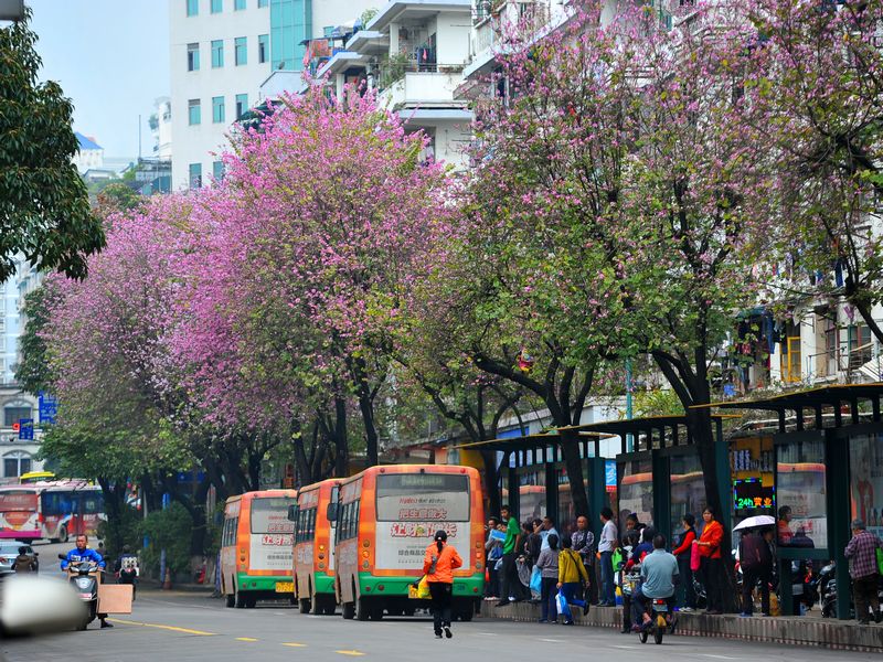 ??? 3月28日,在梧州市阜民路,道路一側的紫荊花樹綻放出滿樹粉紅色的花朵。