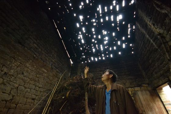 ????由于冰雹擊穿屋頂,雨水直落屋中,黃振其一家五口不得不打著手電筒趕山路,冒著大雨到親戚家借住。