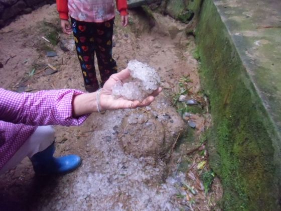????當(dāng)天上午,斌塘五組的村民開(kāi)始清掃冰雹。古太村村支書梁彩昌說(shuō):“單單斌塘五組,就掃出了10多堆冰雹,有的堆至0.8米高,最大的冰雹有拳頭大,直徑10厘米左右?!?/p>