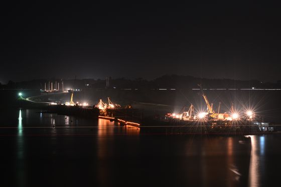 3月27日晚,西江三橋項目施工人員挑燈夜戰,搶抓四個主墩的承臺和樁基施工。 梁萍 李懷舟 攝