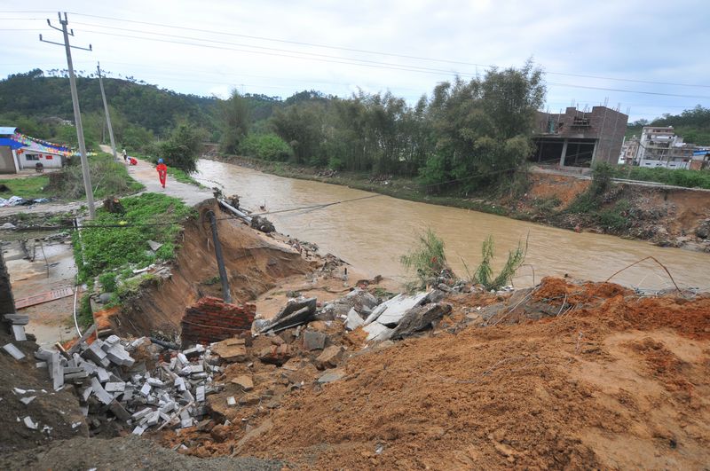 ??? 3月31日,龍圩區廣平鎮夏村橋旁邊的一處護岸出現坍塌,供電線路受損。