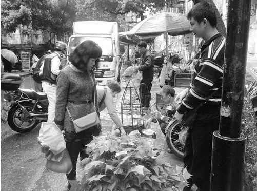 ?4月1日,市民在新興市場選購楓葉制作黑糯米飯。梁燕如 攝