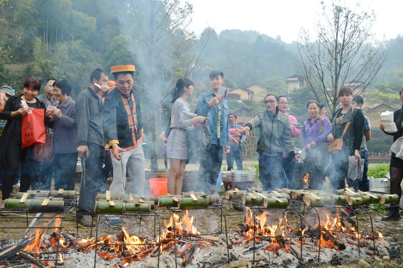 4月2日,在蒙山縣長坪瑤族鄉(xiāng),村民正制作竹筒飯給游客品嘗。