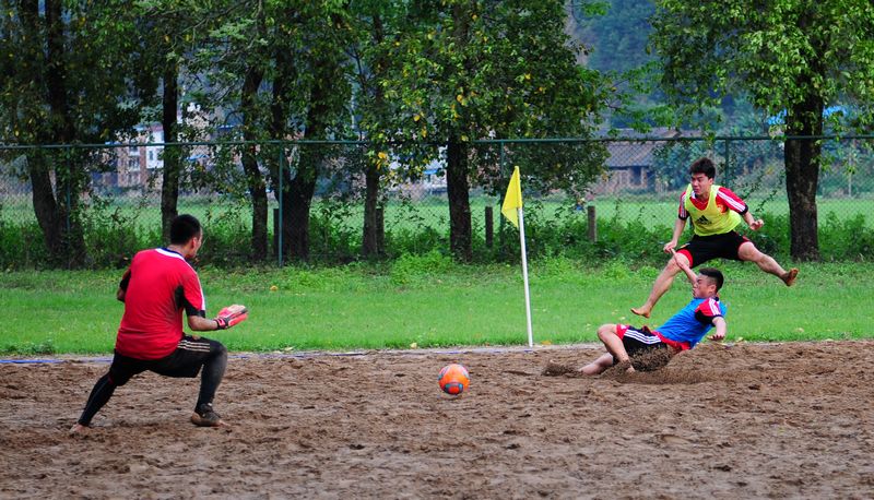 ????沙足的另一大特點是具備偶然性。因為在厚厚的沙上作戰,中長距離的直線傳球幾乎是談不上成功率的,一個沙坑或者沙堆足以讓奔向球門的球指不定轉向哪里,因此,在比賽中對沙地的戰術運用更為關鍵,傳球失誤率增大的情況下如何適應控球和傳球的節奏,是教練和隊員需要共同研究的。沙灘足球有句話叫“盡量讓球飛起來”,就是為了控制球的運行軌跡,盡量采用空中傳球,起中球或高球。一些近距離任意球經常見到這樣的配合:一個隊員起球到半空,另一個隊員瞅準防守方的空當凌空抽射,觀賞性極強。“在射門的這個技術環節上,我們要求隊員都能具備打彈地球的技術。由于沙地不平整,球觸及沙地后有可能瞬間改變方向、速度,這也相當考驗守門員。”