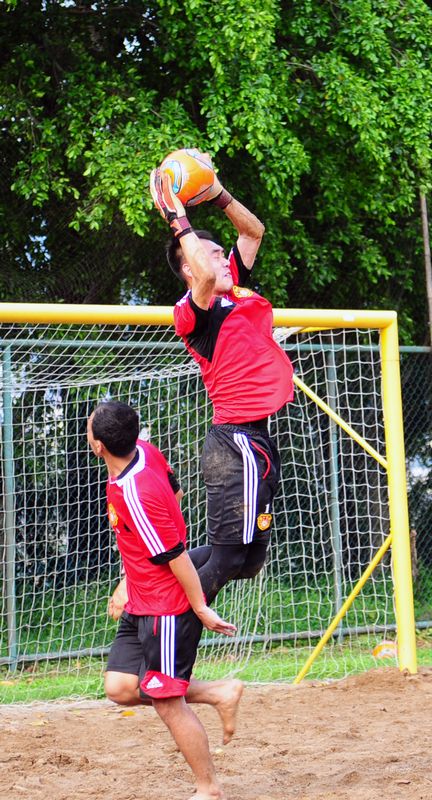 ????凌鷺輝舉例說,沙足所使用的球材質比較輕,要是射門時發力足,在守門員面前球將呈現飄移的狀態,加上沙足運球的軌跡不規則,守門員無法如11人制足球的守門員那樣一直接球,而是盡量把球撲擋出去。如果看到球是彈地的,要第一時間向前壓,盡量在球彈第二下的時候就把球控制住。如果讓球接連彈第二、第三下,球就會改變方向改變速度,會更難控制。