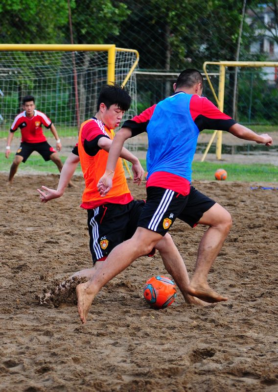 ????也正是這偶然性,使得沙足的看點大大增加,不少在11人制足球賽中不太常見的技術都能在沙足的賽場上實現。隊員在接球以后,可以自如地運用凌空抽射、倒掛金鉤、平行傳球等技術,即使摔倒在地,只要球員夠靈活,還可以繼續控球和傳球,而沒有在草地或硬地被擦傷的擔憂。“一般來說,沙足在射門、空中傳遞的配合以及攻防轉換的速度上,會比11人制足球賽更快,比賽中的控球、傳遞球不會太多,通常我們要求隊員在2到3次觸球以后就要完成射門動作。射門以后,如果沒有進球,球出界了,緊接著會有角球、界外球出現,由此也會有更多戰術的配合,這些都會是新的看點。可以說,每一場沙足比賽都會有精彩的射門。”金正民頗為自信地言道。
