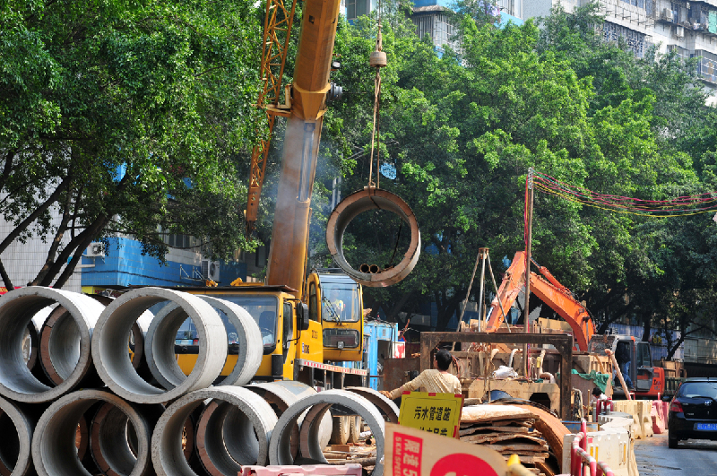 ????4月4日,在富民路,工人正吊裝污水排放處理系統(tǒng)的混凝土預(yù)制件。