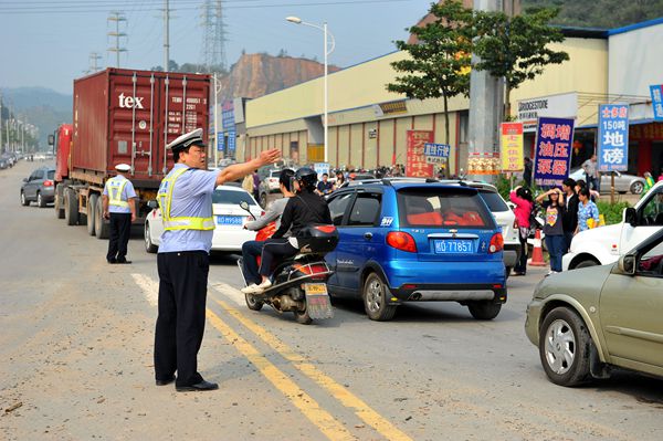 交警在梧州市仙風山墓園前道路維持秩序。4月5日上午,因往仙風山墓園的車流量激增,梧州市富民路沿線交通出現(xiàn)短暫擁堵。西江都市報記者 何鎏/攝