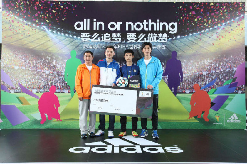 ????今年2月,為推進(jìn)足球運(yùn)動(dòng)在各地青少年群體中的開展,給青少年提供一個(gè)親臨世界杯的機(jī)會(huì),阿迪達(dá)斯公司與校園足球聯(lián)盟舉辦2014年世界杯護(hù)旗手的選拔。此次選拔以北京、上海、廣州、成都為賽區(qū),各賽區(qū)推選出一名14-17周歲的中國(guó)青少年,擔(dān)任世界杯半決賽的護(hù)旗手。