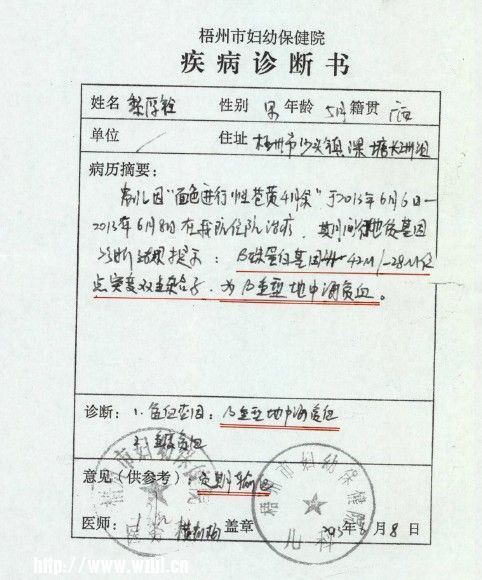 ????據黎承進說,小厚銓目前沒有生命危險,每個月要到梧州市進行一次輸血治療,如果延誤輸血,孩子就會變得沒有精神,吃喝都沒有力氣。“每當想到孩子輸血前頹靡不振、輸血后活蹦亂跳兩個樣子,我就心痛不已,除了給他湊醫藥費輸血,我還能做什么?”