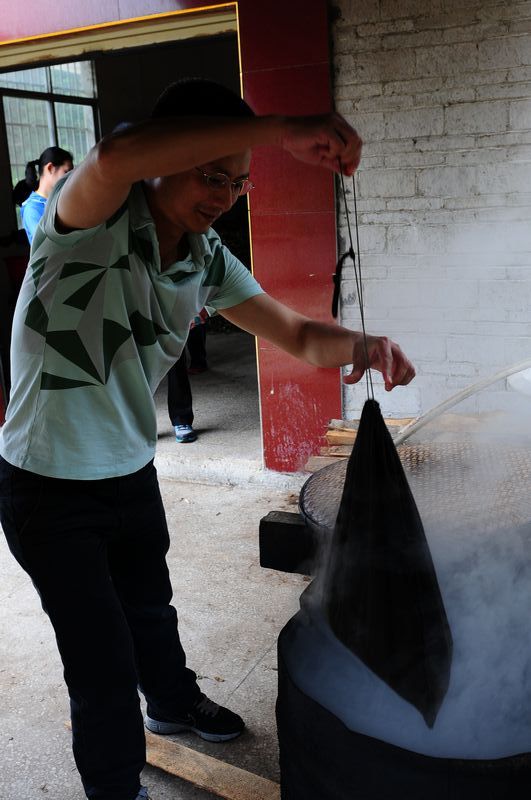 ????制作六堡茶的第一道工序是“殺青”,是加工中的關(guān)鍵一環(huán)。經(jīng)過高溫殺青,散發(fā)茶葉葉內(nèi)水分,鈍化酶的活性,并使鮮葉中的內(nèi)含物發(fā)生一定的化學(xué)變化,從而形成其特有的品質(zhì)。