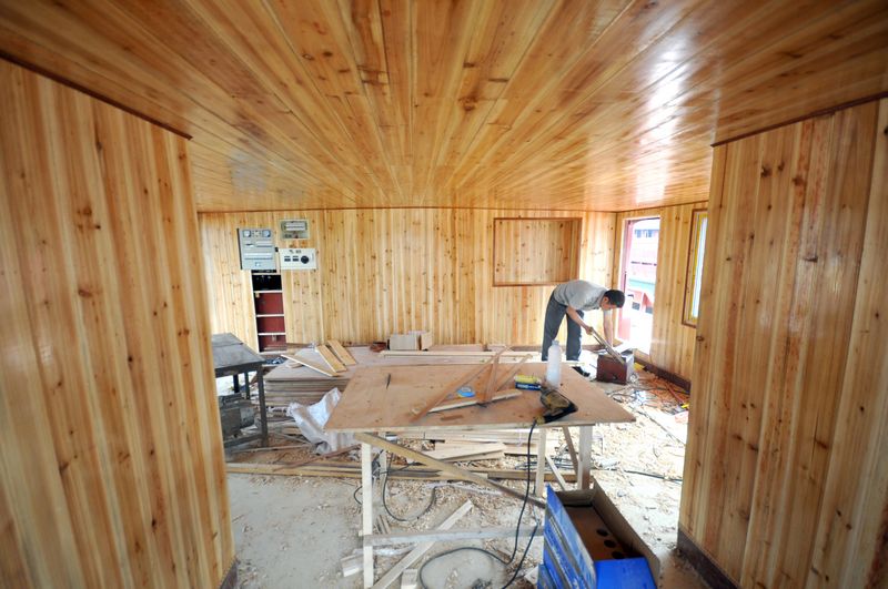 一艘即將完成制造的貨船生活艙內,施工人員正根據船主的需要在進行室內裝修。