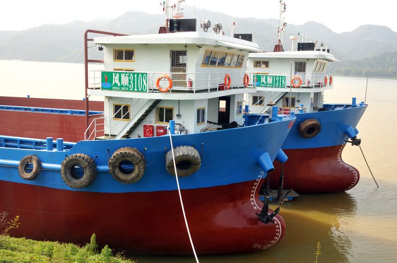 兩艘已制造完成的貨船停靠在藤縣順舟船廠對出的西江岸邊。