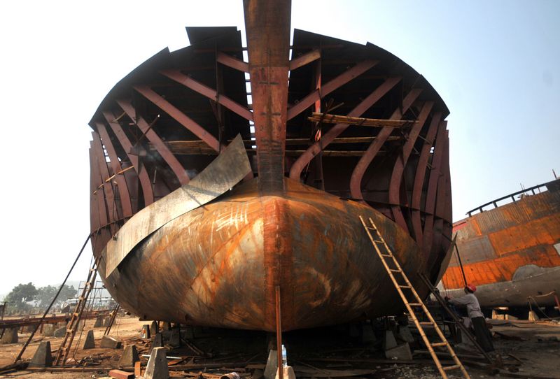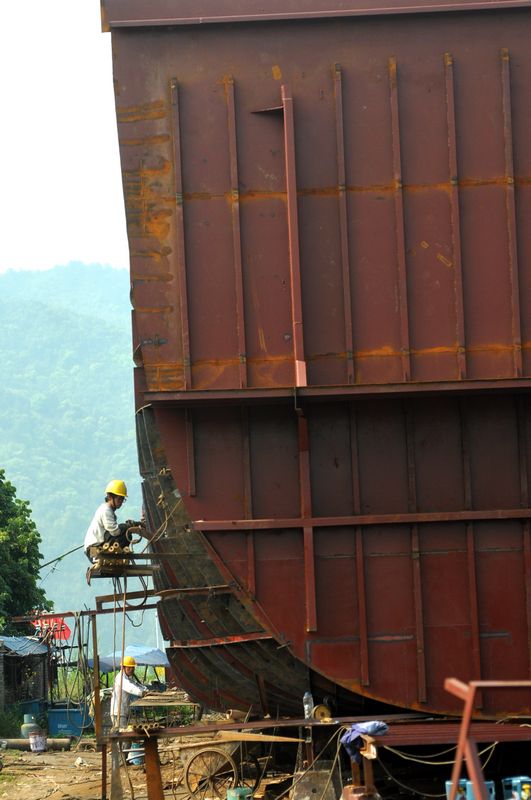 施工人員正在碩大的船體外作業。