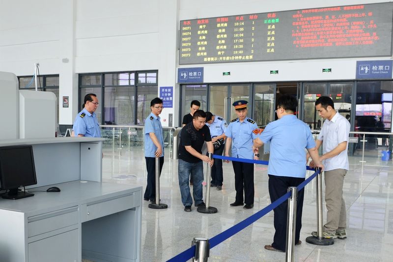 ?連日來,南廣鐵路藤縣火車站工作人員對站內安檢設施、售票窗口、營運時間表、廣播訊息等系統設施進行全面檢驗,并對員工進行設備操作培訓,確保南廣鐵路南寧至梧州段開通營運時各種設備正常、安全運轉。